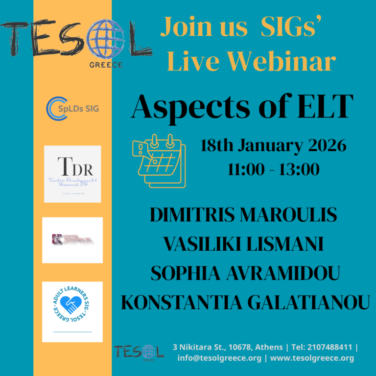 Join us at the TESOL Greece SIGs’ Live Webinar “Aspects of ELT” Post author:admin Post published:11/01/2026 Post category:News Click here to access the Event Page You Might Also Like Wishing You a Wonderful Summer! 01/08/2025 Happy Birthday TESOL Greece!!! 30/01/2026 Join TG at the 36th IP Exhibition 25/03/2019